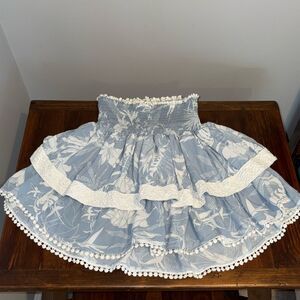 Excellent condition, SURF GYSPY Mini Skirt Size S. Skirt has 4” wide elastic waist that is very stretchy. Top of waist has small round trim, which is also on the bottom ruffle of the skirt. First ruffle of the skirt has 1.5” of white crocheted trim.