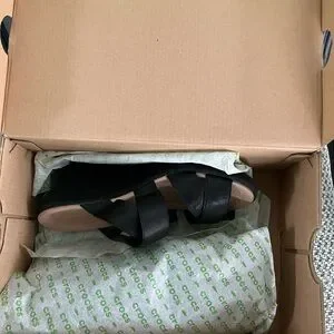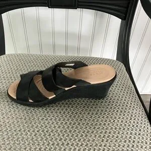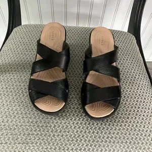 Experience the perfect blend of style and comfort with these Crocs wedges. Featuring a black leather design with intersecting wide straps, these sandals work with jeans and skirts alike. The cushioned footbed and wedge heel keep them both classy and comfortable. Worn a few times; excellent condition. Smoke-free, pet-free home.
