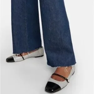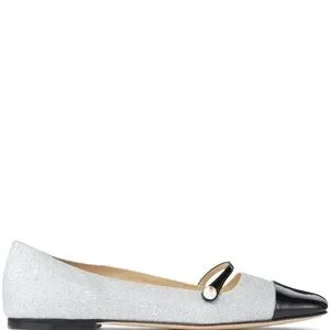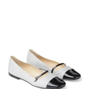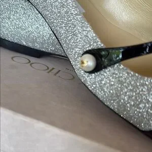 These Jimmy Choo flats feature a striking silver glitter body paired with a glossy black patent leather toe cap. A delicate black strap with a pearl detail adds a touch of elegance, making them perfect for both formal and casual occasions.
