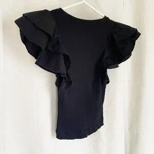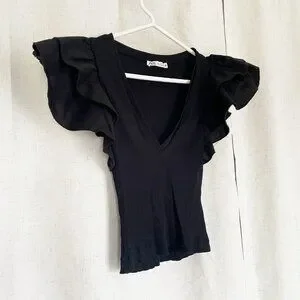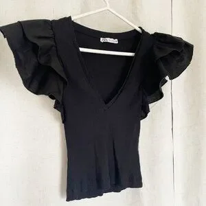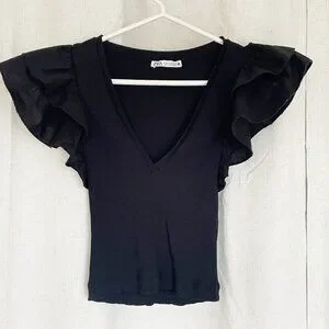 Zara black ribbed top with ruffle sleeves. Cropped length. Small size.