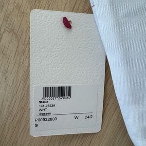 This elegant white mini dress by STAUD features a sophisticated mock neck and short sleeves, perfect for a bridal or wedding guest occasion. The sheath style offers a sleek and modern silhouette, while the mandarin collar adds a touch of refinement to the minimalist design.
