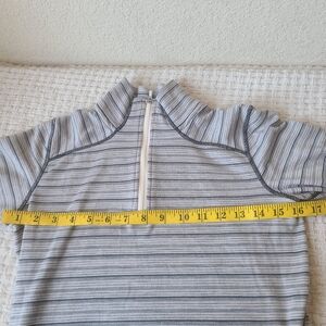Smartwool Striped Gray Quarter-Zip Pullover Women's Size M. Preowned. Minor wear. Merino wool. Stylish gray pullover with a quarter-zip design. Features a striped pattern for a modern look. Measurements Included In pictures. Good Condition. Smoke Free Home. Offers Welcome.