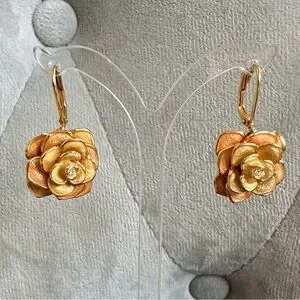 These elegant floral earrings feature a stunning gold and tan design, perfect for adding a touch of sophistication to any outfit. The intricate flower detail is both unique and eye-catching.