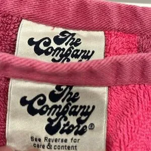The Company Store Towel Set - Large Hand Towels - Approximate size is 27” x 19”. No defects or stains noted. We do not smoke and have no pets. Some slight fading of the trim as pictured. darker pink colors. Very high quality, very heavy towel and is larger than a normal hand towel. 100% Cotton.
