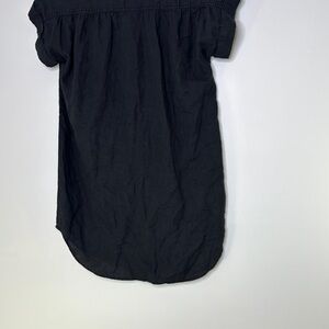 This sleek black linen shirt dress by Cloth & Stone features a minimalist design with a longer length and a curved hemline. Its short sleeves and rolled cuffs add a relaxed touch, making it perfect for casual outings. The solid black fabric ensures a versatile and timeless look.
