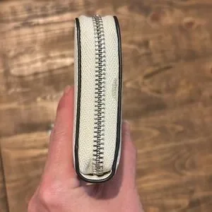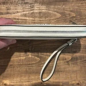 Chic Calvin Klein wristlet in light beige. Compact and stylish with a handy strap.