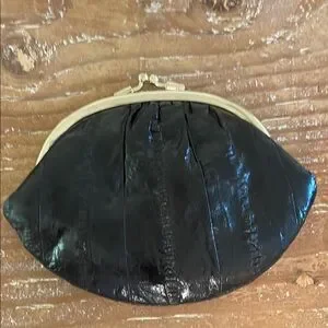 This black clutch is crafted from a glossy Genuine EEL Skin , offering a sleek and minimalist design. Its compact shape and smooth surface make it a versatile accessory for any occasion a touch of elegance to its overall appearance. See Pictures EUC no signs of wear Double coin 1970s