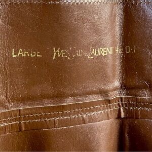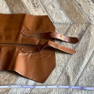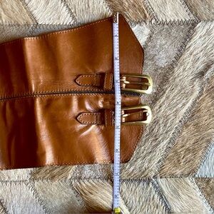 You will be super SNATCHED in this coveted vintage 1990s Yves Saint Laurent brown leather corset belt with two buckle adjustment. Marked a size large, this belt fits true to modern sizing with the length to first buckle hole at 30”L (30”-31.5” L adjustment). The belt width has a slight curvature around the ribs for comfort (5.5”W to 6.5”W in the front). Super hot. I know I will regret selling but doing some fundraising. Buy before I change my mind!
