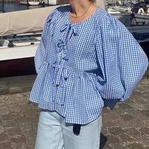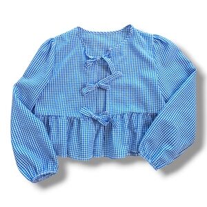 Chic and stylish blue blouse featuring elegant bow-tie details. Perfect for any occasion.