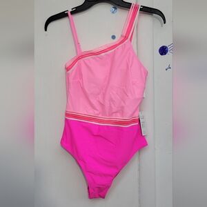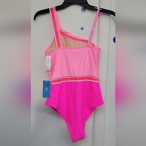 This stunning one-piece bodysuit from Cupshe features a chic asymmetrical design with a single shoulder strap. The vibrant pink shades create a striking color-block effect, while the cutout detail at the waist adds a modern touch. Crafted from high-quality swimwear material, it offers excellent stretch and water resistance for a comfortable fit.