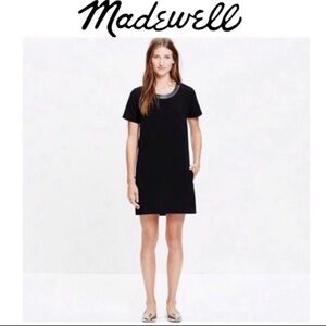 MADEWELL Black Leather Trim Neckline Tee Dress Short Sleeve With Pockets Size XS