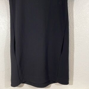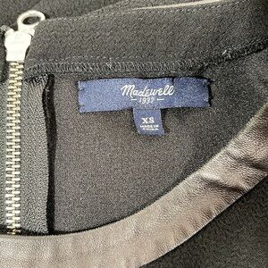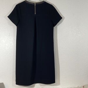 Madewell leather trim tailored black tee dress. An easy all-day-turn-into-night shift dress in Madewell's favorite textural crepe. A leather neckband adds a fuss-free touch of luxe to the tee style shape. Inverted pleat in back with exposed silver zipper. Has pockets.