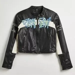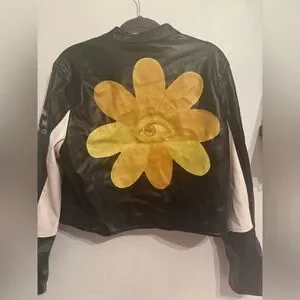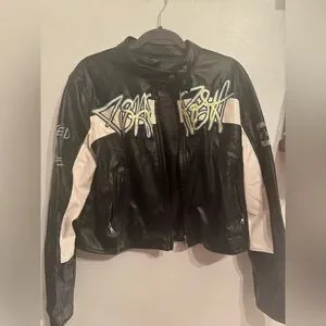 Stylish black and white leather jacket featuring bold graphic designs. Perfect for adding an edgy touch to any outfit.