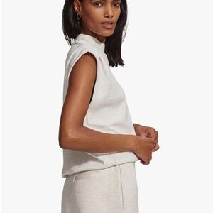 Embrace a relaxed yet stylish look with the Varley Cream Muscle sweat. This sleeveless top features a mandarin collar and a boxy, relaxed fit, perfect for a contemporary wardrobe. Crafted in a soft cream hue, it offers a modern aesthetic with its clean lines and structured fabric.