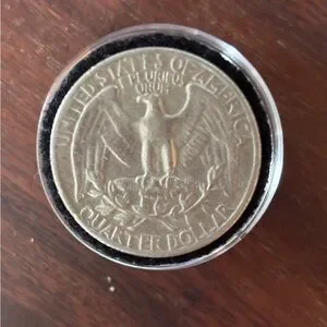1967 Liberty coin with mint errors. In good shape. Rim error. Mint dye error on the nose, dribble error on the mouth corner, also inside mint circular error across the top of Washington’s head (top) continuing around circumference of coin. No mint mark.