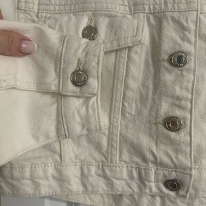 This cream jean jacket from Zara features a cropped length and traditional styling, making it a versatile addition to any wardrobe. Its neutral color and classic design ensure it pairs effortlessly with various outfits, offering both style and comfort.