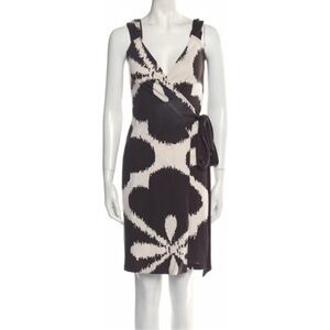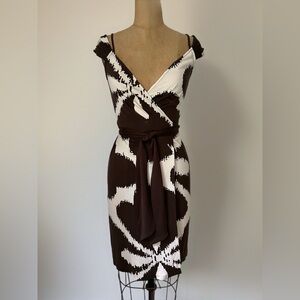 Iconic Diane Von Fustenberg wrap dress with bold floral batik brown and off white pattern. Cap Sleeve design with additional spaghetti strap. Perfect for any occasion. Great used condition. Please look at pictures for condition.