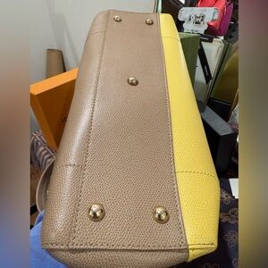 Discover the perfect blend of style and functionality with this Furla satchel. The striking yellow and cream color combination adds a touch of sophistication, while the structured silhouette ensures practicality. Crafted with attention to detail, this bag is a standout accessory for any occasion. There is a couple of discoloration places on the bag. The bag is in great condition.