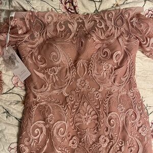 This stunning sheath dress by JJs House is crafted in a captivating dusty rose hue, perfect for mother of the bride/groom. The off the shoulder design and intricate lace overlay add a touch of elegance and sophistication, making it an ideal choice for the perfect occasion.