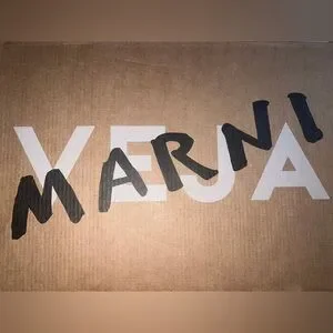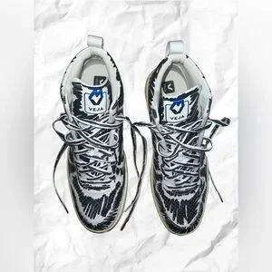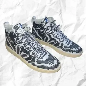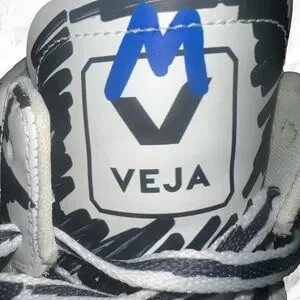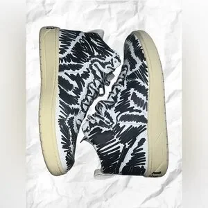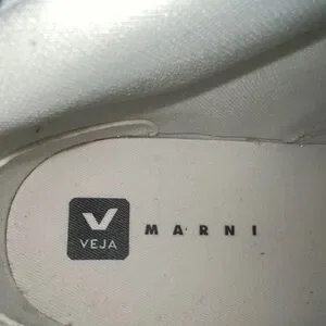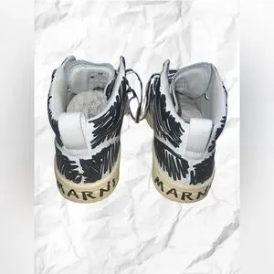 Veja X Marni collaboration high top leather sneaker. With sneaker with marker scribble in black throughout. Logo on tongue, pull tab on back heel. A bold design for those that want to stand out.