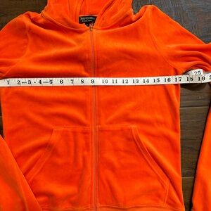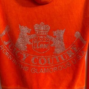 Vibrant orange velour jacket with sparkling logo detail. Hooded design with long sleeves.