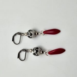 Pair of black leverback earrings with black floral patterned porcelain beads, featuring red glass points