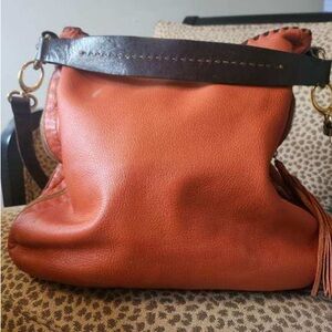 Stylish orange leather shoulder bag with a dark brown strap. Perfect for everyday use.