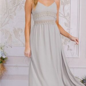 WOMEN'S SLEEVELESS V-NECK LACE DETAILED FRONT POCKETS MIDI DRESS IN GREY