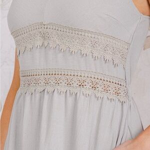 sleeveless design, V-neckline, lace detailed accents, front pockets, midi length, breathable fabric, comfortable fit, versatile styling options