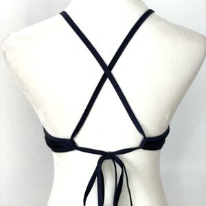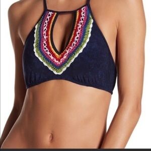 Literally the most flattering top. It fits so perfectly and has the cutest keyhole in front. The crochet scalloped multicolor trim around the vneck keyhole adds such a cute detail. Wear as a bikini top or pair with shorts as a crop halter top. Navy blue with hot pink, white, red, yellow, bright green, and black crochet trim. Criss cross ties in back. Matching bikini bottoms sold under a separate listing. New with Tags.