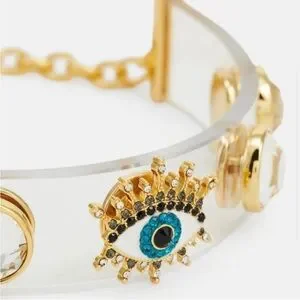 This exquisite bracelet from Kurt Geiger showcases a mesmerizing eye-shaped charm with a vibrant blue center, surrounded by gold-toned accents. The adjustable gold-toned lobster clasp ensures a perfect fit, making it a standout piece in any jewelry collection.