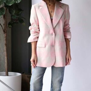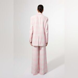 Violante Silkcheck is a classic, tailored blazer with an oversized fit. Its made in an exclusive pink linen silk mixed fabric with a subtle check pattern. The fabric comes from an exclusive Italian mill. Violante is designed with regular shoulders and regular sleeve length. It has two flap pockets and two-colored buttons at front. Match the blazer with the wide leg pant Ada Silkcheck for a minimalistic summer uniform for all occasions.