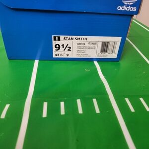 Brand New Adidas Stan Smith White Sneakers Never Worn. Size Men's 10.5 Classic Adidas Stan Smith sneakers. Sleek white design with blue accents. Comfortable and stylish.