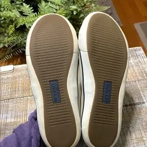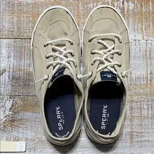 Sperry sneakers with beige canvas. Features rope white laces and a classic look. In good used condition; washed and ready to wear! Women’s size 9!