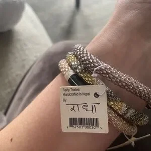 women artists crochet Lily and Laura bracelets with the finest glass beads in the world. They enjoy above fair trade wages while creating beautiful bracelets at home. The bracelets are comfortable and stylish to wear and simply roll over your hand!