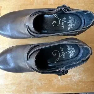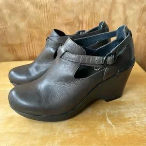 Dansko Franka Heeled Wedge Gray Brown Leather Strappy Ankle Bootie
