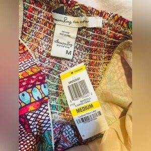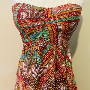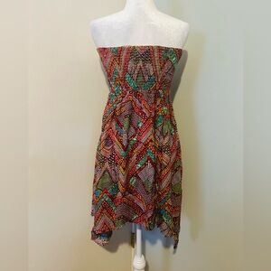 This stunning strapless sundress by American Rag features a vibrant red and orange color palette, perfect for a cocktail night out. The asymmetrical high-low hemline adds a touch of elegance, while the lightweight fabric ensures comfort and style. With its fitted bodice and flowing skirt, this dress is a chic choice for any evening occasion.smocky design in the back the dress, size medium