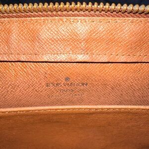 A classic 1990s Louis Vuitton wristlet clutch, the Orsay Monogram Pochette is crafted in iconic Monogram canvas with natural vachetta leather trim. This French-made piece features a single top-zip compartment, a front slip pocket for quick access, and a detachable leather wrist strap with gold-tone hardware. The date code AR1915 confirms production in early 1995. A stylish and functional vintage accessory perfect for daily use or collection.