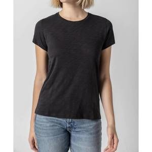 Introducing the Lilla P Short Sleeve Crewneck Tee in classic black, crafted from their popular Loose Knit Slub fabric. This tee features a pull-on closure and is made from 100% cotton, ensuring comfort and breathability. With a length of 24" for size medium, it's an ideal staple for any wardrobe. Care is easy with machine wash instructions. Style Number: PA2169.