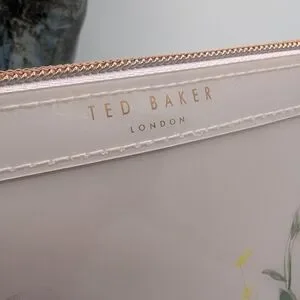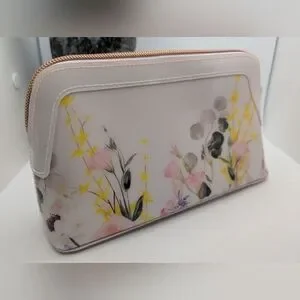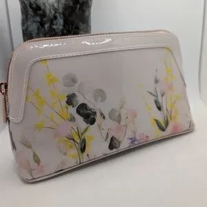 Discover the elegance of Ted Baker's cream and pink cosmetic bag, featuring a sophisticated floral pattern that adds a touch of charm to your essentials. Crafted with a structured rectangular shape and rounded edges, this bag combines style and functionality. Perfect for organizing your cosmetics, it showcases Ted Baker's signature blend of modern design and timeless elegance.
