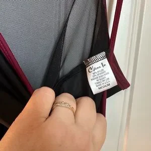 Elegant black leotard featuring beautiful floral embroidery. Pretty burgundy trim. Runs LARGE. Tagged Yumiko for exposure.