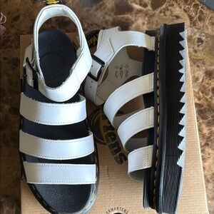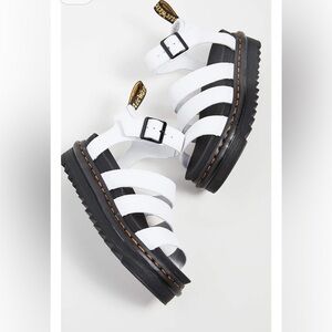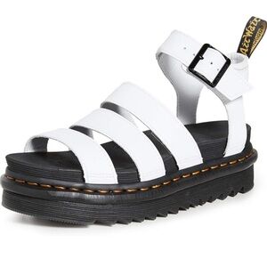 These Dr. Martens sandals feature a bold black sole with white leather straps, offering a modern and minimalist look. The chunky platform provides excellent elevation and comfort, while the open-toe design and heel strap ensure a secure fit. Perfect for versatile styling, these sandals effortlessly blend style and functionality.