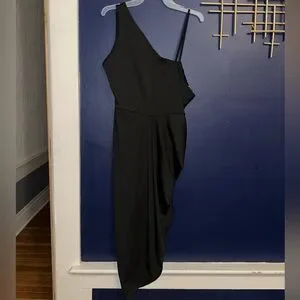 This elegant black evening dress features a stylish asymmetrical design with a sparkling bodice. Perfect for special occasions, it offers a sophisticated and chic look.