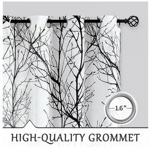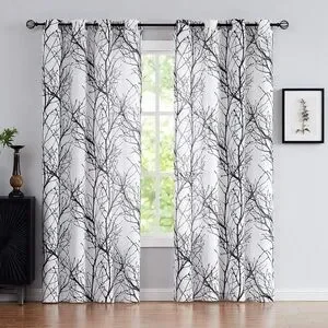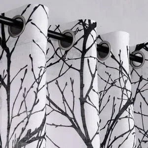 Gently used white linen curtains with gray branches printed across the fabric. These are sold has a set (x2).