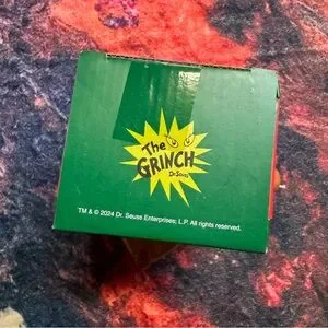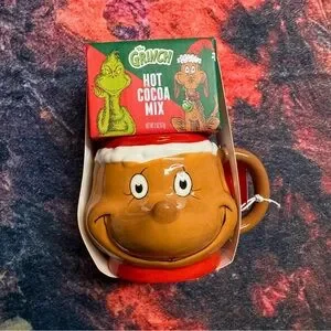 Enjoy a cozy drink with this Grinch-themed mug set. Features a mug shaped like Max the Dog’s head. Includes hot cocoa mix. NWT