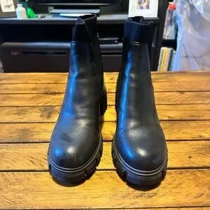 These Steve Madden ankle booties boast a sleek black leather design with a chunky rubber sole, perfect for a stylish yet durable look. The elastic side panels allow for easy slip-on access, while the sturdy tread pattern ensures excellent grip and stability. Ideal for those seeking a robust and fashionable footwear option.