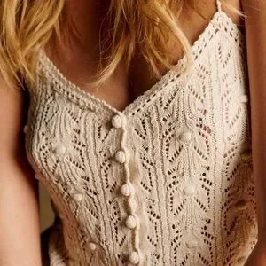 Chic and vintage-inspired, this cream-colored knit tank features intricate pointelle-style crochet detailing throughout with scalloped edging & covered buttons down the front. The slim fit & delicate V neckline give it a soft feminine silhouette. Style it with denim for a relaxed French-girl summer look or tuck into a maxi skirt for effortless elegance.