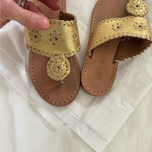 Great condition. These Jack Rogers sandals feature a metallic gold leather upper with a classic whipstitch design, complemented by a distinctive circular medallion on the top strap. The slip-on style offers a comfortable fit with a flat brown leather footbed, perfect for casual summer outings. Loved photos of our little girl wearing them out for a couple summer dinners on the Cape! But she grew out of them so quickly we didn’t even get a full season.