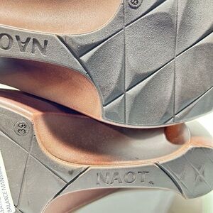 Naot is an Israeli footwear company known for its comfortable and supportive shoes, particularly those with cork and latex footbeds. These boots are mid-calf height and feature a wedge heel. The upper is made of brown leather with decorative straps and brass-colored studs. The footbed is designed to mimic the shape of the foot, providing arch support and promoting proper alignment. Naot shoes are handcrafted with Italian leathers and are designed for comfort and durability.