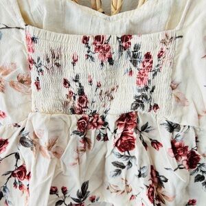 This charming blouse from American Eagle Outfitters features a smocked bodice with flutter ruffle sleeves and a ruffled hem, all in an off white hue. The cropped design and airy fabric make it perfect for a breezy, stylish look. Ideal for pairing with high-waisted bottoms, this top exudes a vintage-inspired charm.